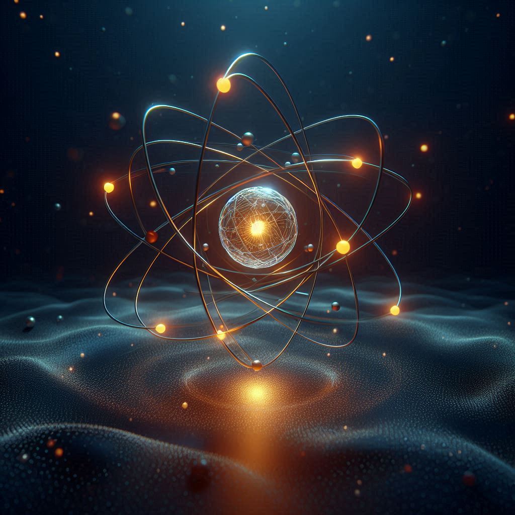 A glowing atom model, with orbiting electrons represented by glowing spheres, rests atop a dark, rippling surface.