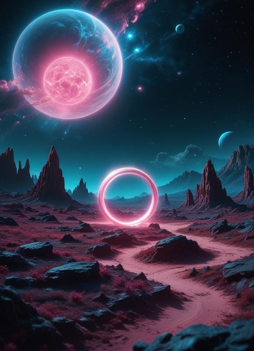 alien, blue, dust, futuristic, galaxy, glowing, ground, landscape, moon, neon, pink, planet, red, ring, rock, sci-fi, sky, space, stars, universe