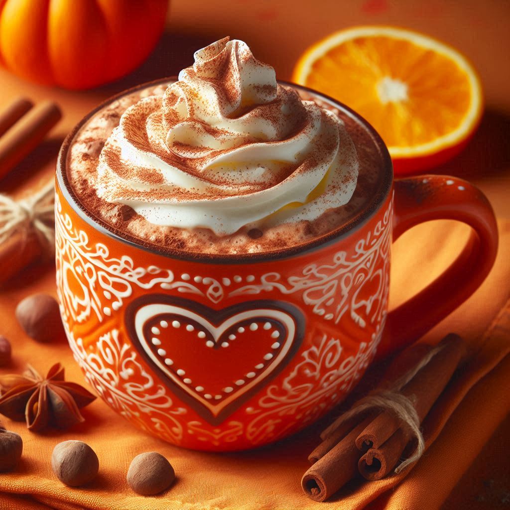 autumn, autumn drink, beverage, cinnamon, cinnamon stick, cocoa, cozy drink, drink, fall, fall drink, heart, heart design, hot cocoa, mug, orange, orange slice, red mug, star anise, warm drink, whipped cream