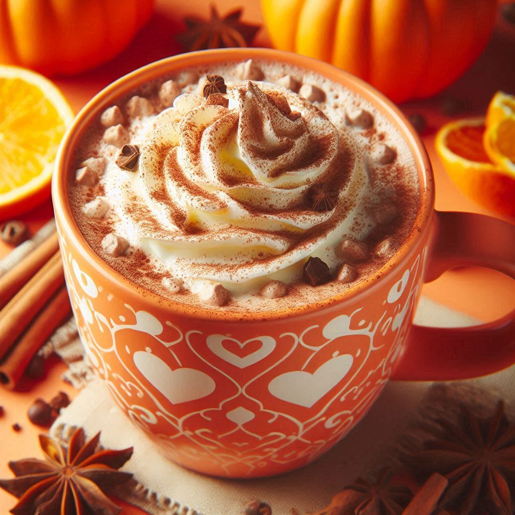 autumn, beverage, brown, cinnamon, coffee, comfort, cozy, drink, fall, food, heart, mug, orange, pattern, pumpkin, seasonal, spices, warm, whipped cream, white