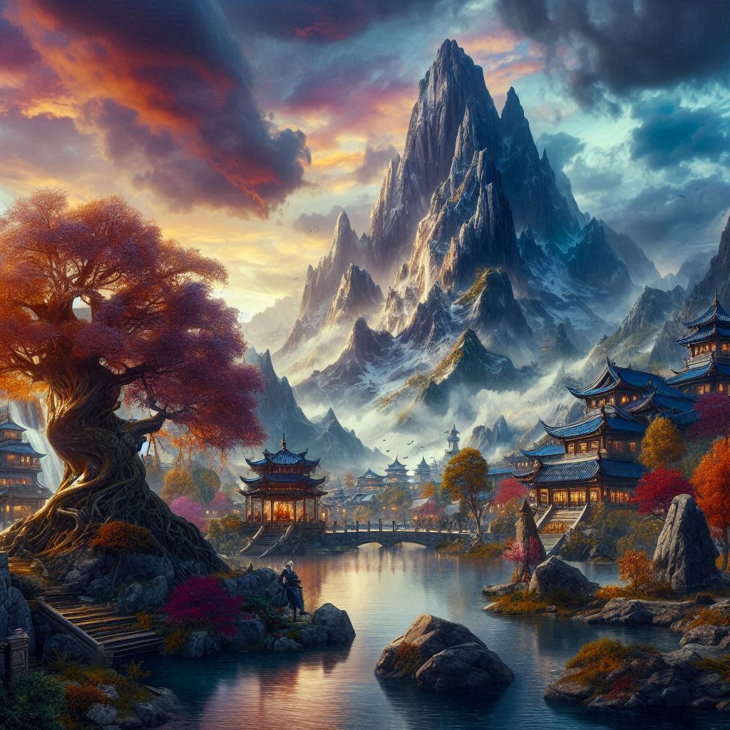 architecture, art, buildings, clouds, digital art, fantasy, lake, landscape, mountain, nature, painting, peaceful, scenery, serene, sky, snow, traditional, tranquil, trees, village