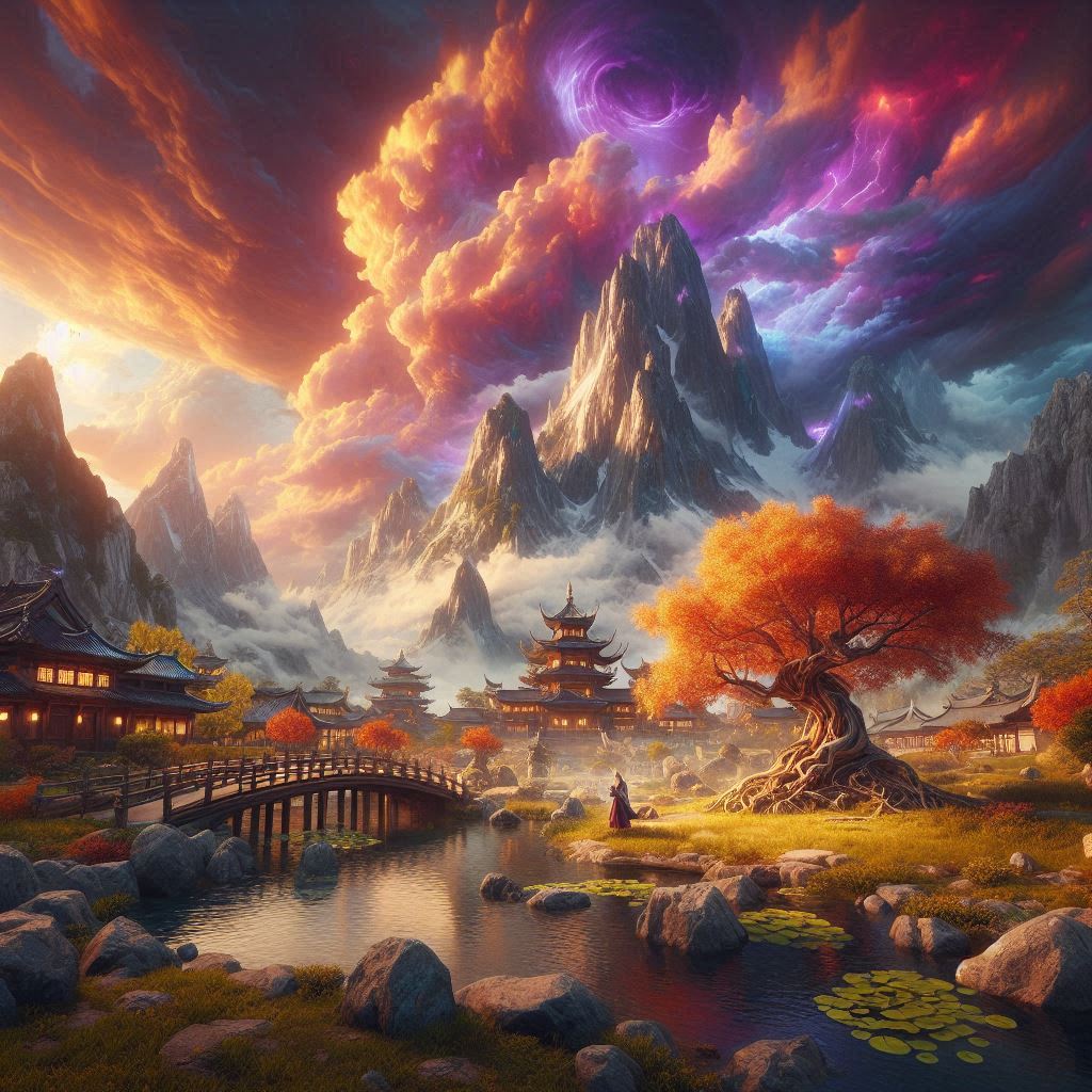 bridge, building, clouds, figure, grass, green, mountain, orange, person, pink, purple, red, river, rocks, sky, sunset, traditional, trees, village, water