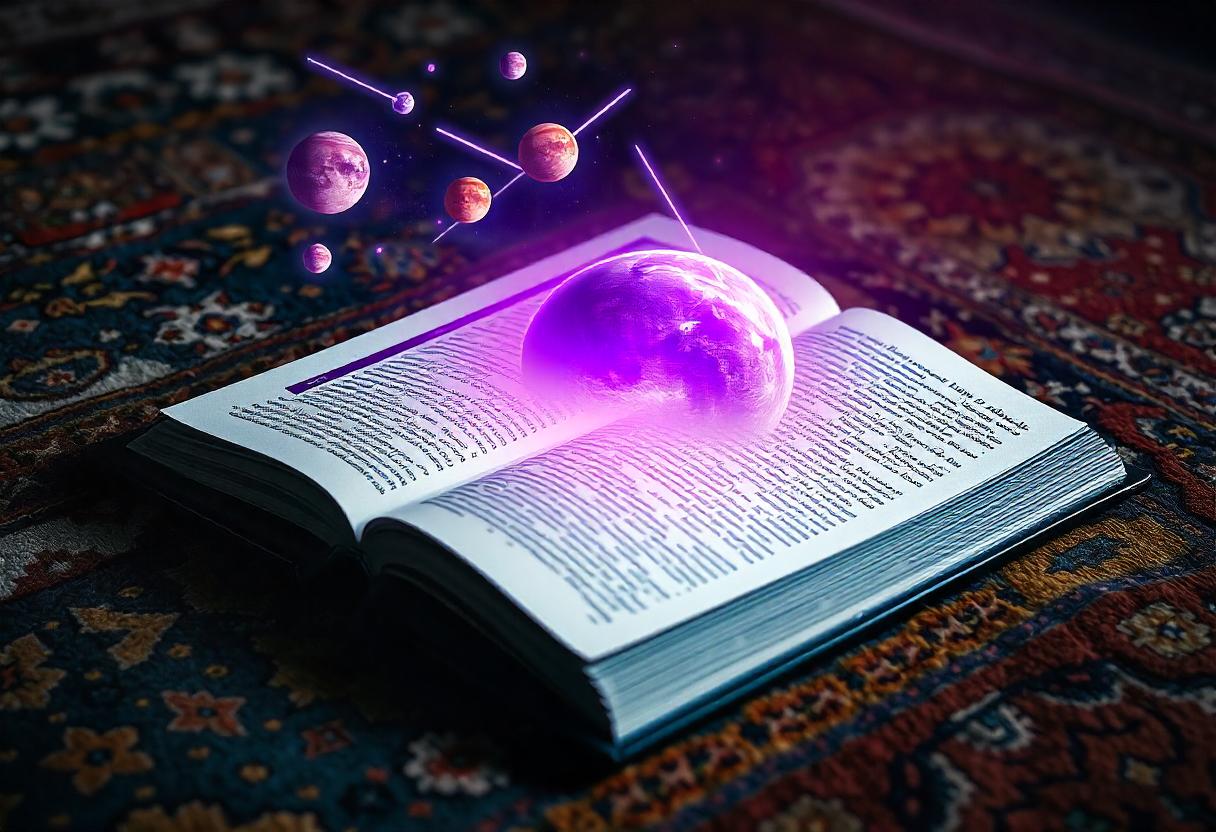 An open book lies on a patterned carpet. A small purple planet glows brightly, hovering above the book.