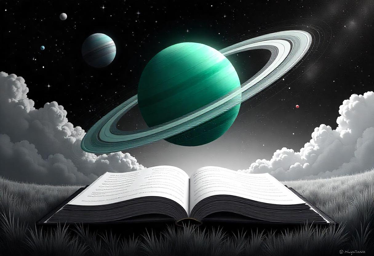 Green planet with rings above an open book