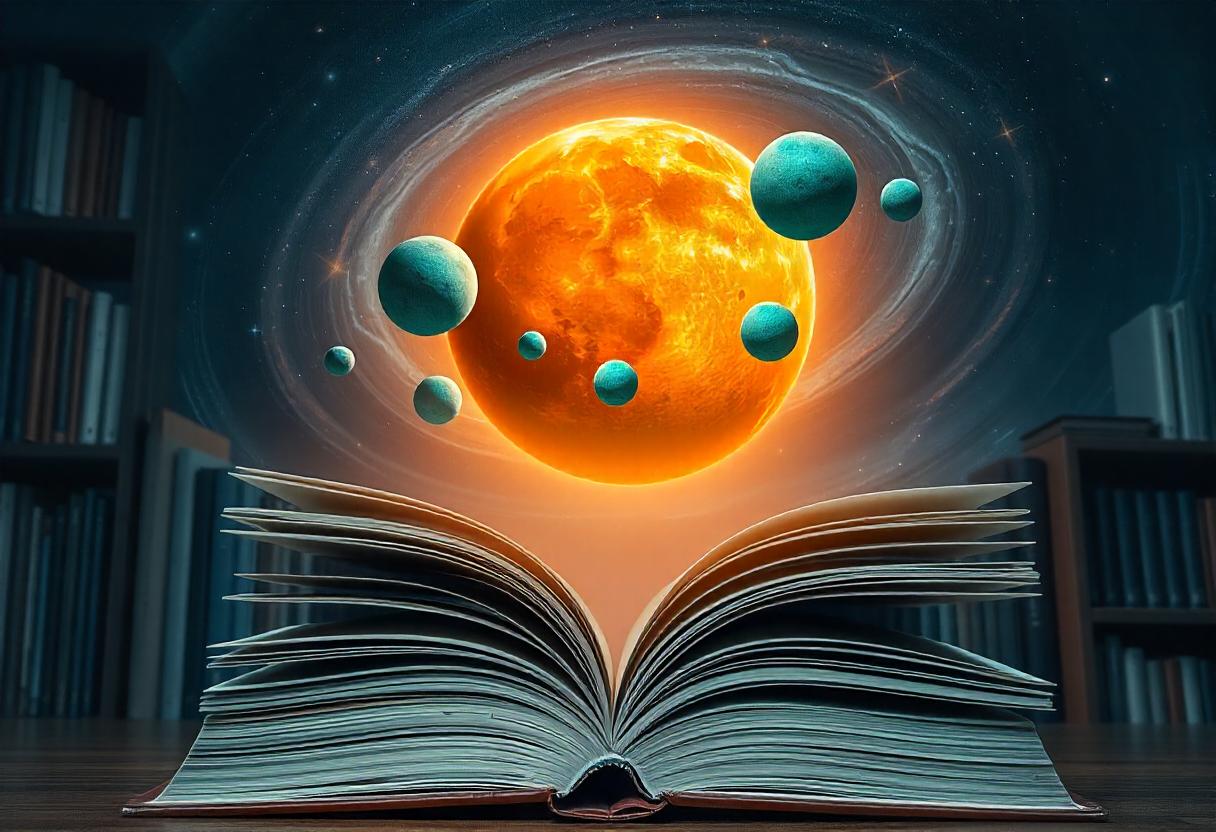 An open book lies on a wooden surface. Above the book is a bright orange sun surrounded by small blue planets.