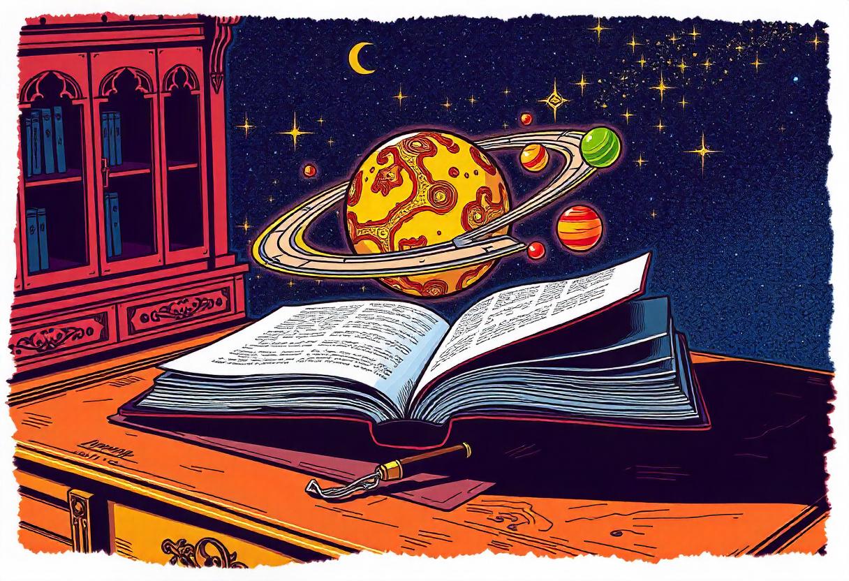 A book sits open on a desk with a ringed planet above