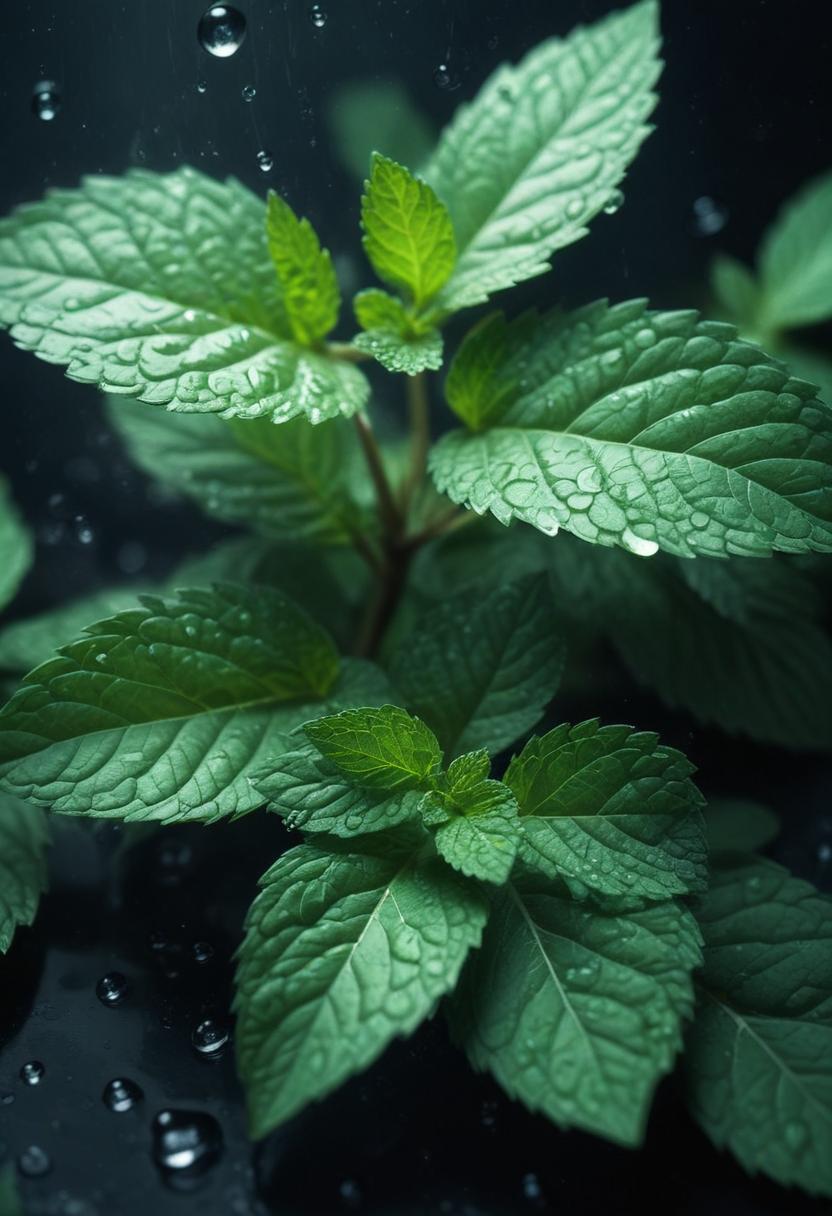 A close-up image of a mint plant with water droplets on its leaves, taken in a dark setting.