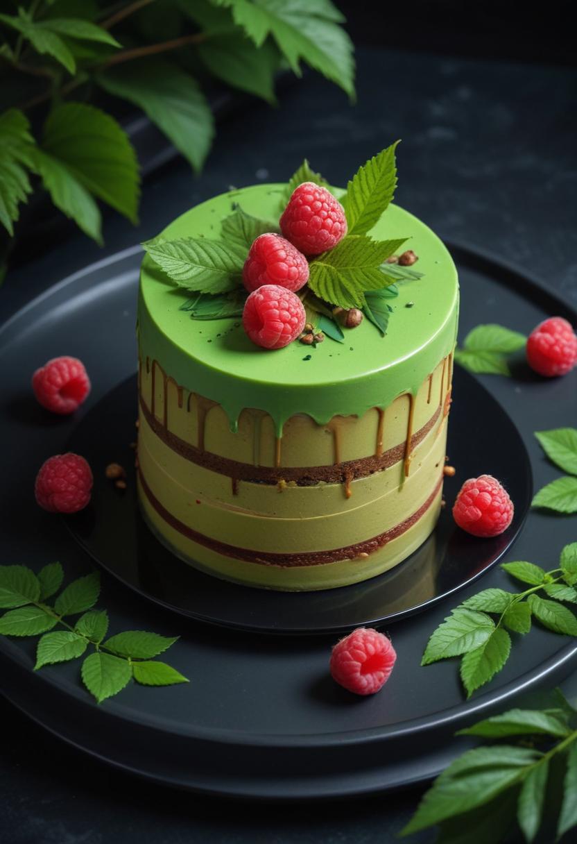 A green cake topped with raspberries and leaves sits on a black plate. The cake has a green glaze and is decorated with a few drops of chocolate.