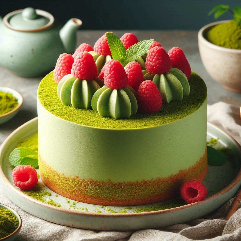 A green tea cake is decorated with raspberries, mint, and a green tea powder dusting. The cake is on a white plate and a linen tablecloth.