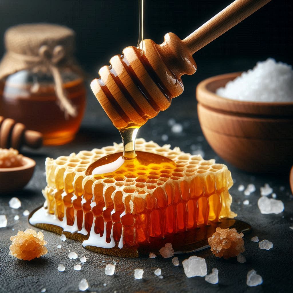 Golden honey drips from a wooden dipper onto a honeycomb, surrounded by white salt crystals.