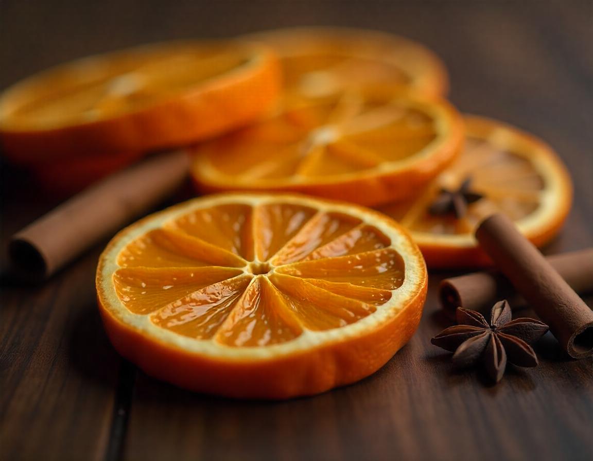 Dried orange slices, cinnamon sticks, and star anise on a wooden surface.