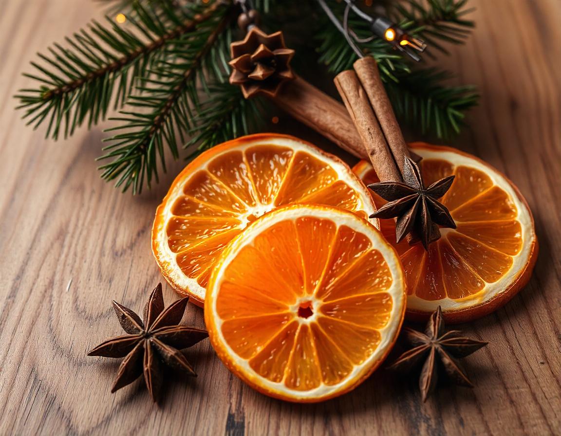 A close-up of dried orange slices, cinnamon sticks, and star anise arranged on a wooden surface.