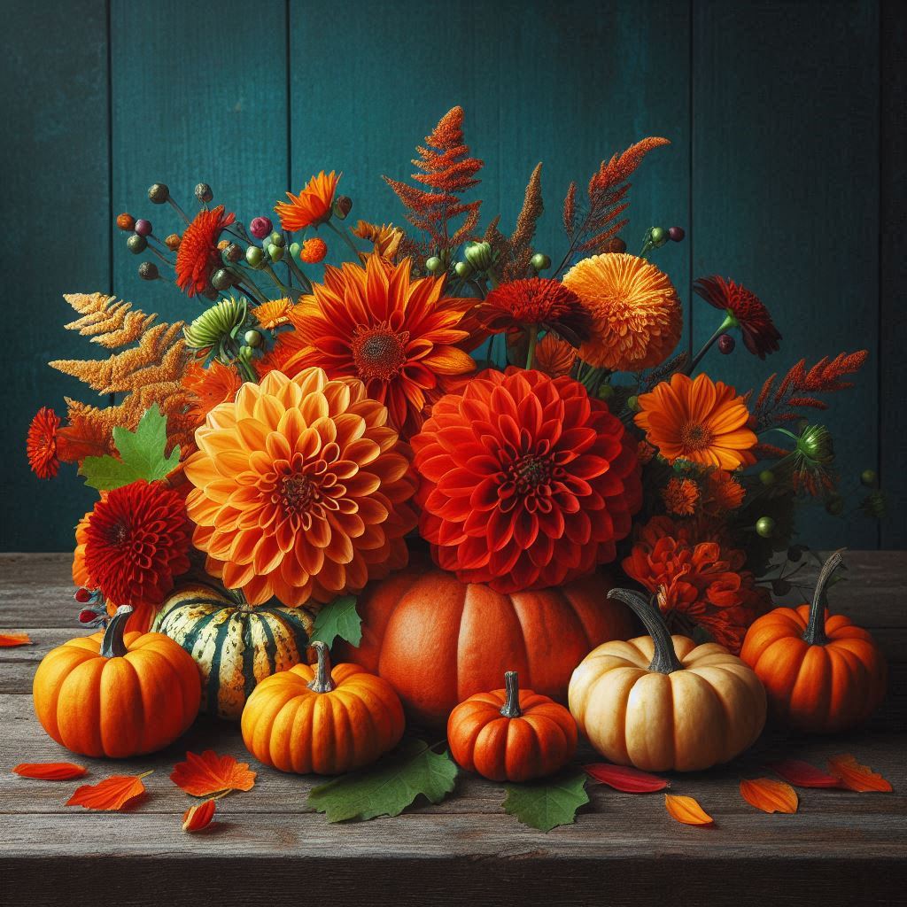 A group of pumpkins and dahlias are arranged on a wooden table against a teal background.