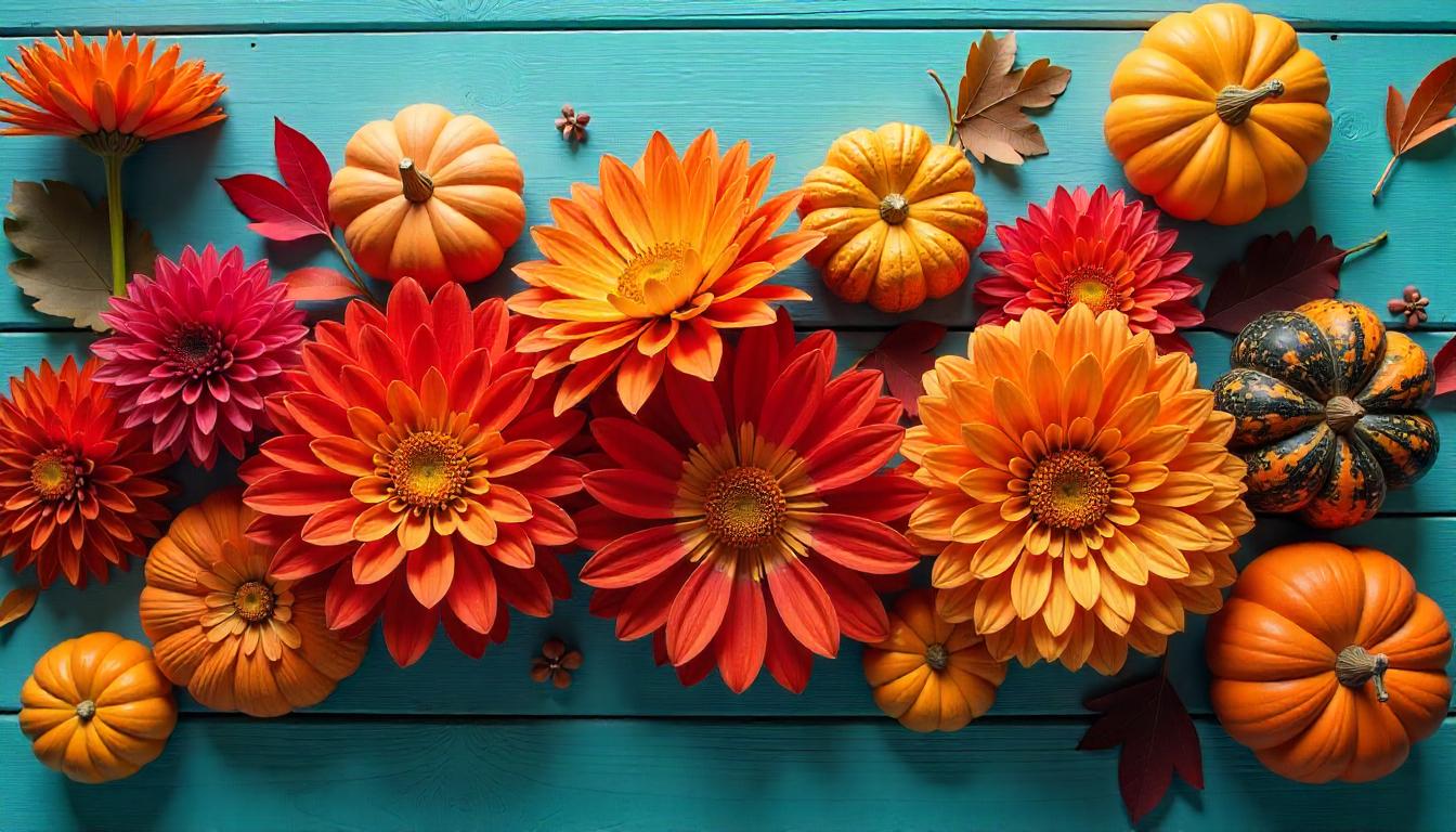 A blue wooden surface is decorated with colorful fall flowers and pumpkins, creating a festive autumnal scene.
