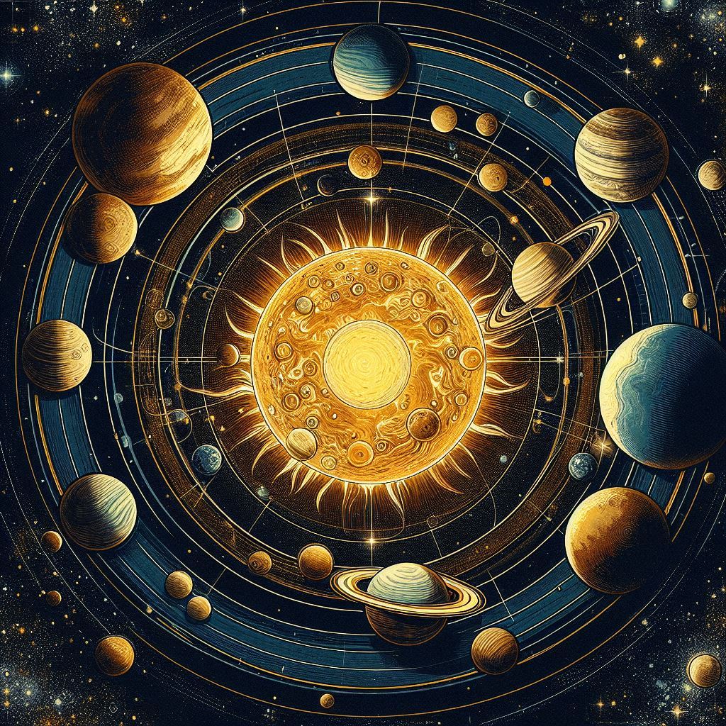art, astronomy, blue, celestial, celestial bodies, cosmic, dark, gold, graphic design, illustration, orbit, planets, rings, solar system, space, starry, stars, sun, universe, yellow