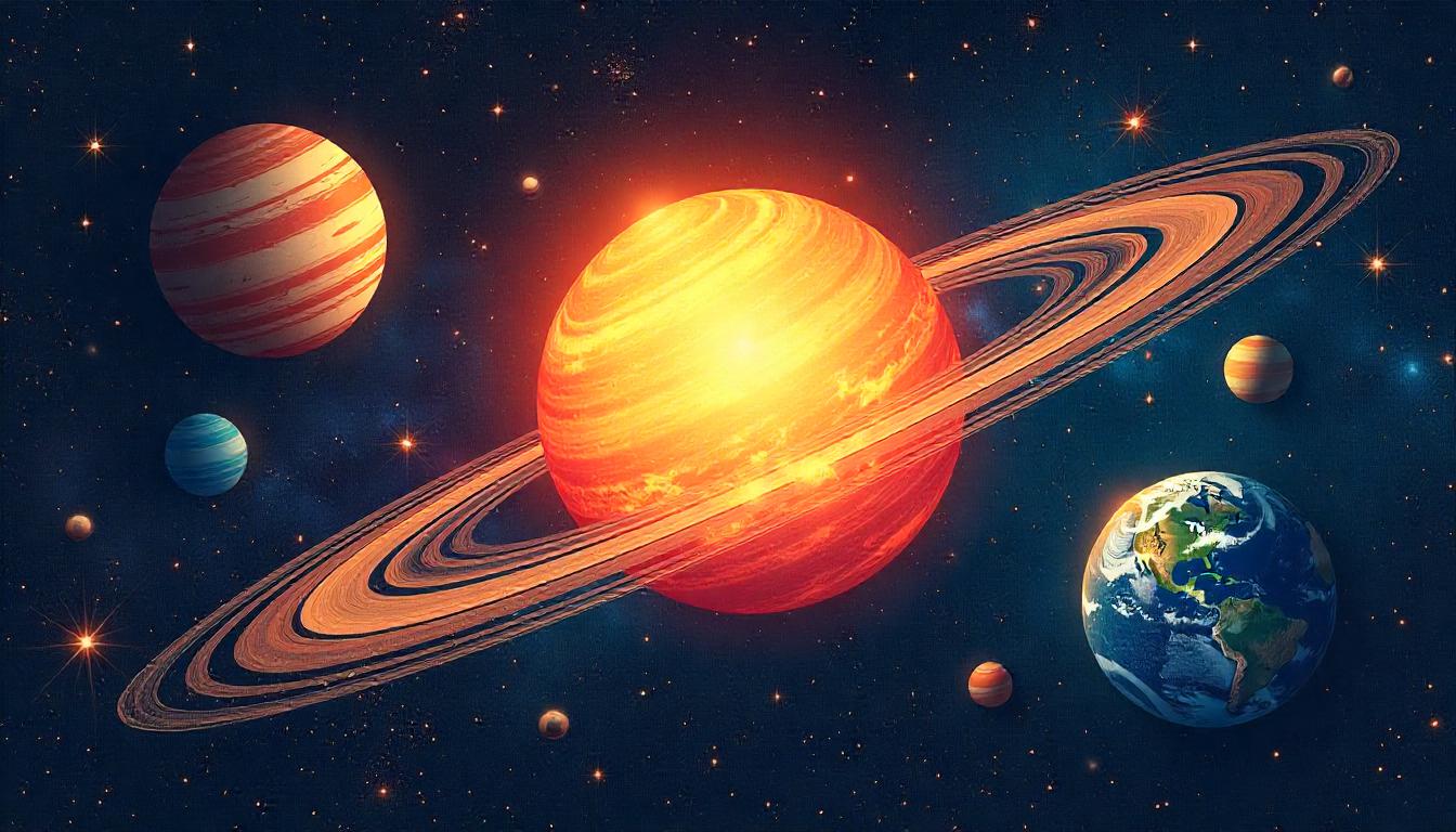 An orange planet with large, prominent rings is surrounded by other planets and stars in a dark, starry background.