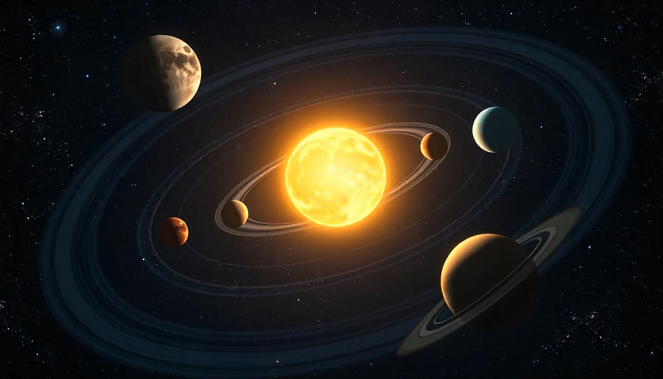 A glowing star surrounded by planets in a dark, starry space