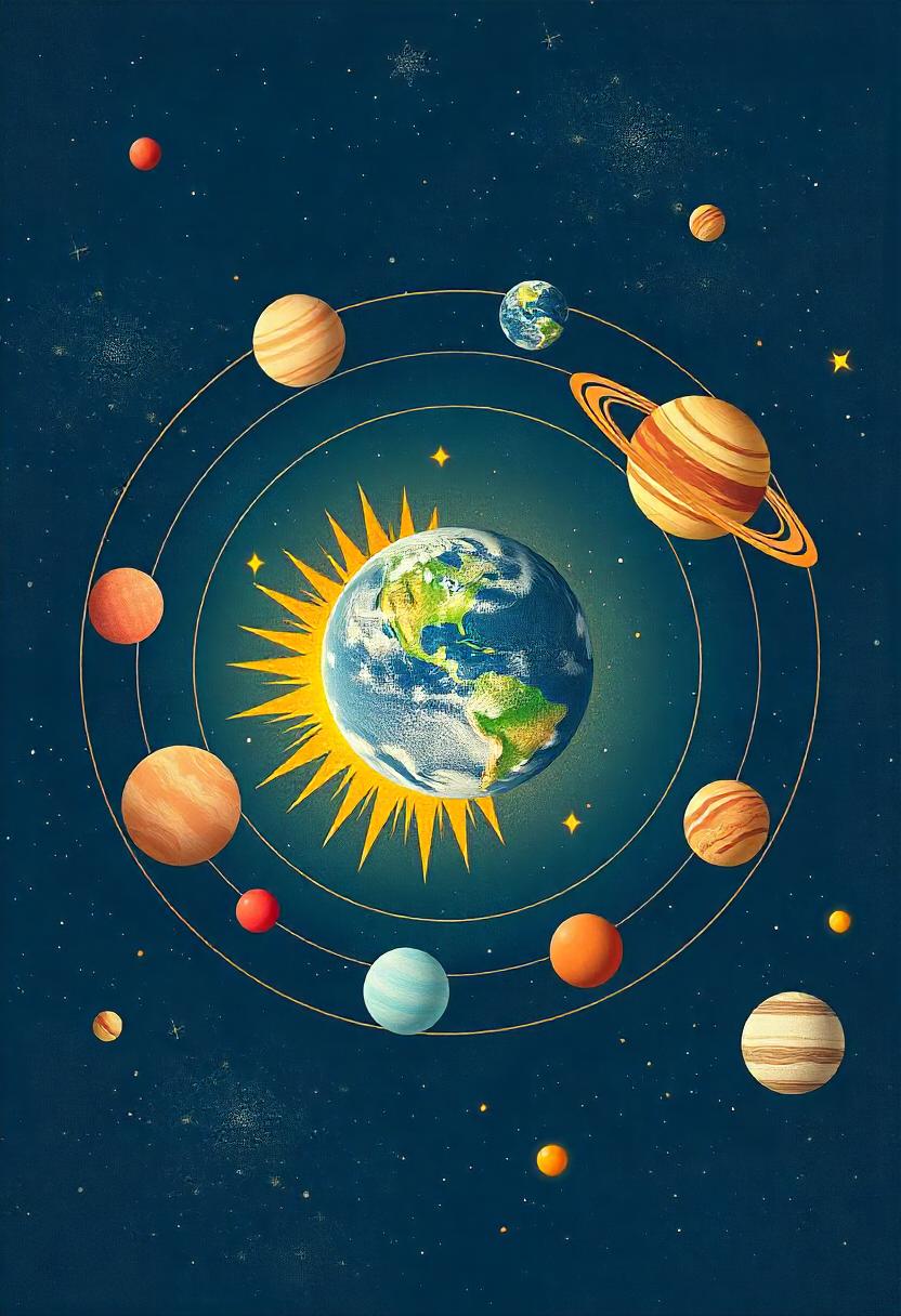 Stylized earth, sun, and orbiting planets illustration