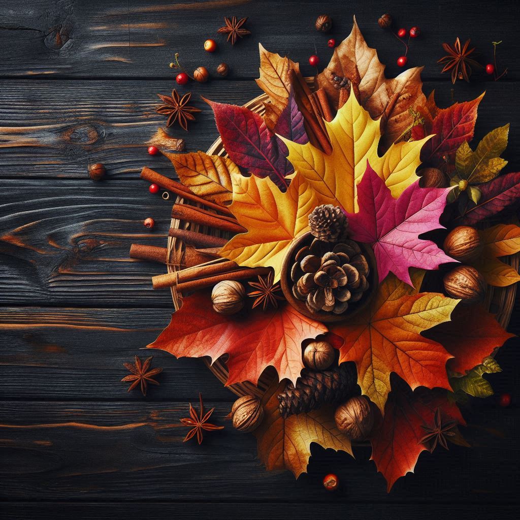 autumn, autumn leaves, background, berries, cinnamon sticks, decoration, fall, fall colors, fall season, foliage, harvest, leaves, nature, nuts, pine cone, rustic, seasonal, table, thanksgiving, wood