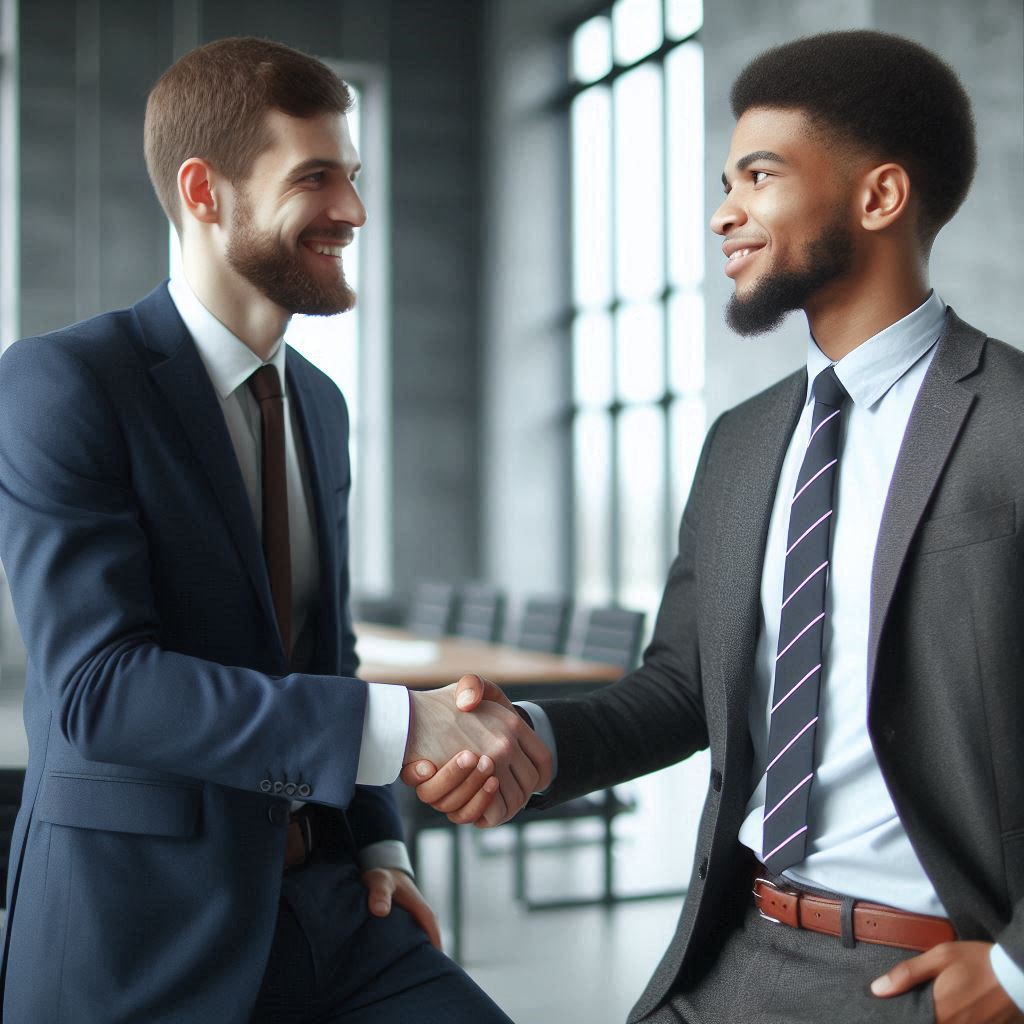 Two men in suits shake hands in an office