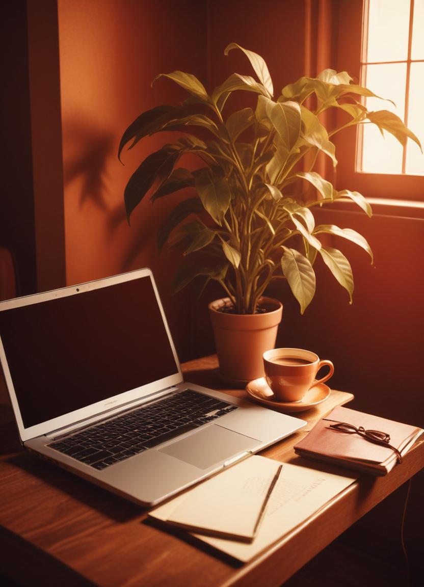 afternoon, brown, coffee, comfortable, cozy, desk, green, home, laptop, morning, office, peaceful, plant, relaxing, study, sunlight, warm, window, wood, work