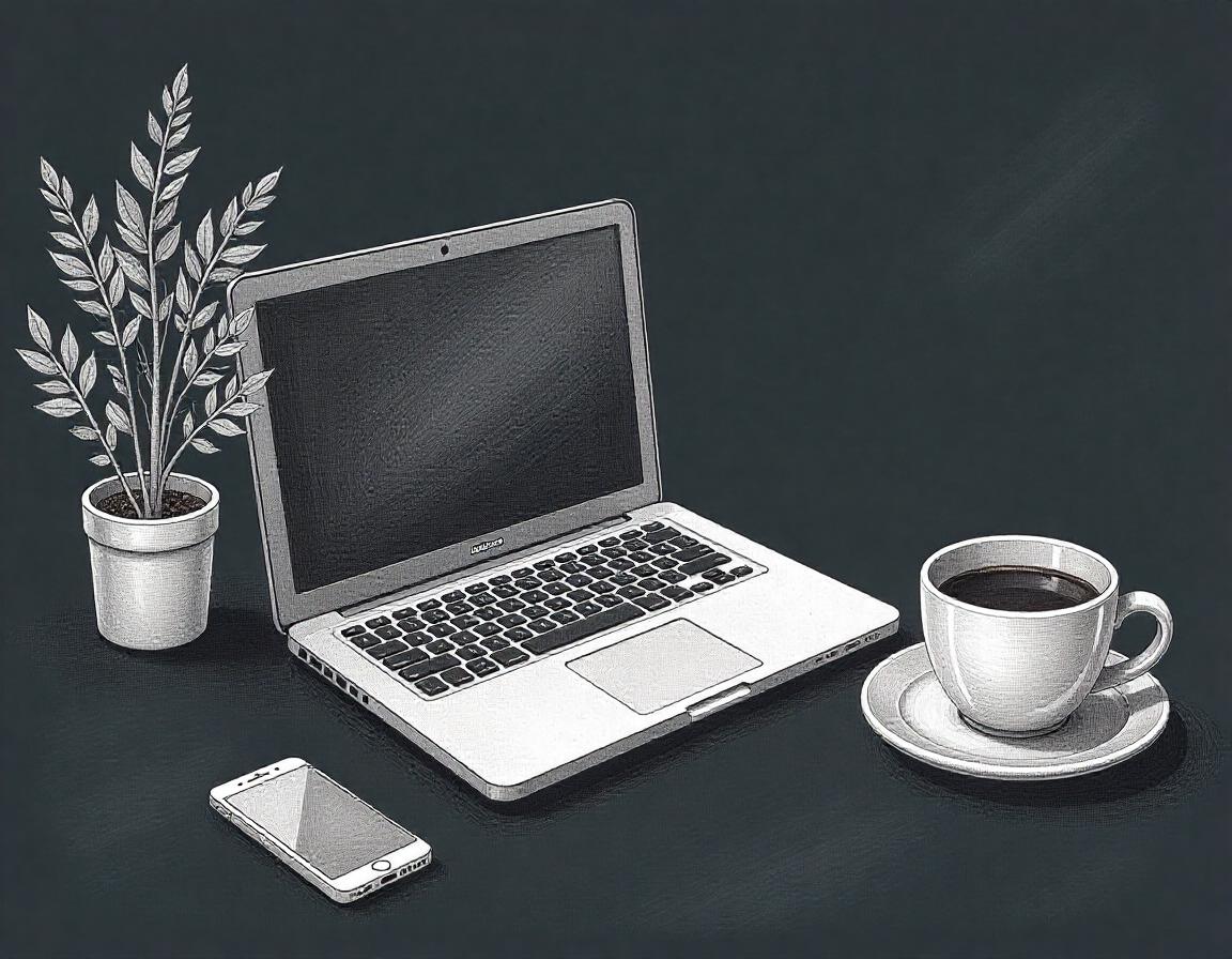 A laptop, phone, and coffee cup rest on a desk, against a dark background. A potted plant sits on the left side of the desk.