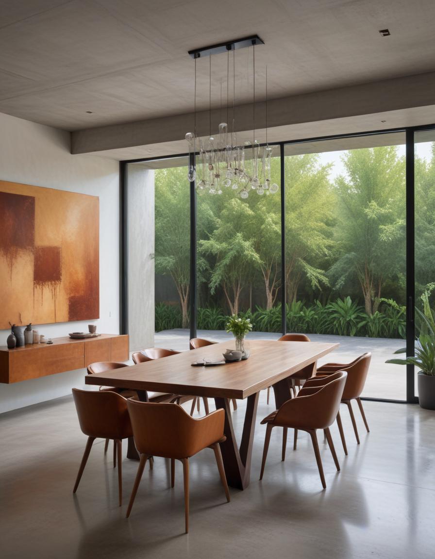 architecture, chairs, chandelier, contemporary, dining room, elegant, garden, green, home, home decor, house, interior design, leather chairs, lush, minimalist, modern, stylish, table, window, wooden table
