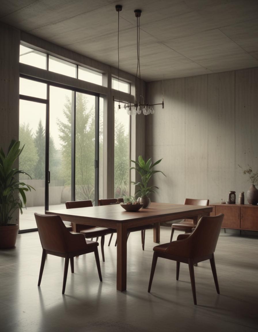 architecture, chairs, contemporary, decor, design, dining room, furniture, garden, home, house, interior design, light fixture, minimalist, modern, plant, room, space, style, table, windows