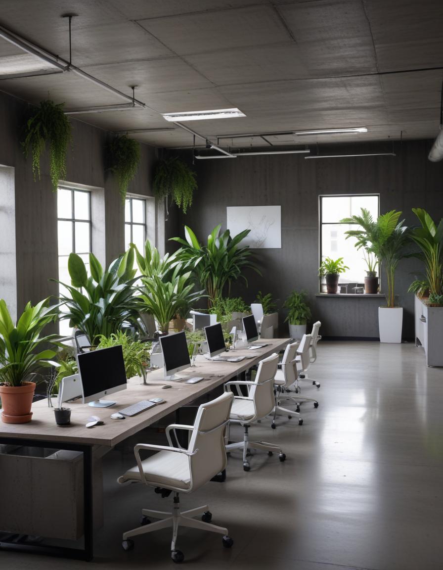 business, chairs, computer, contemporary, decor, design, desk, furniture, gray, green, interior, minimalist, modern, office, plants, professional, style, table, work, workspace