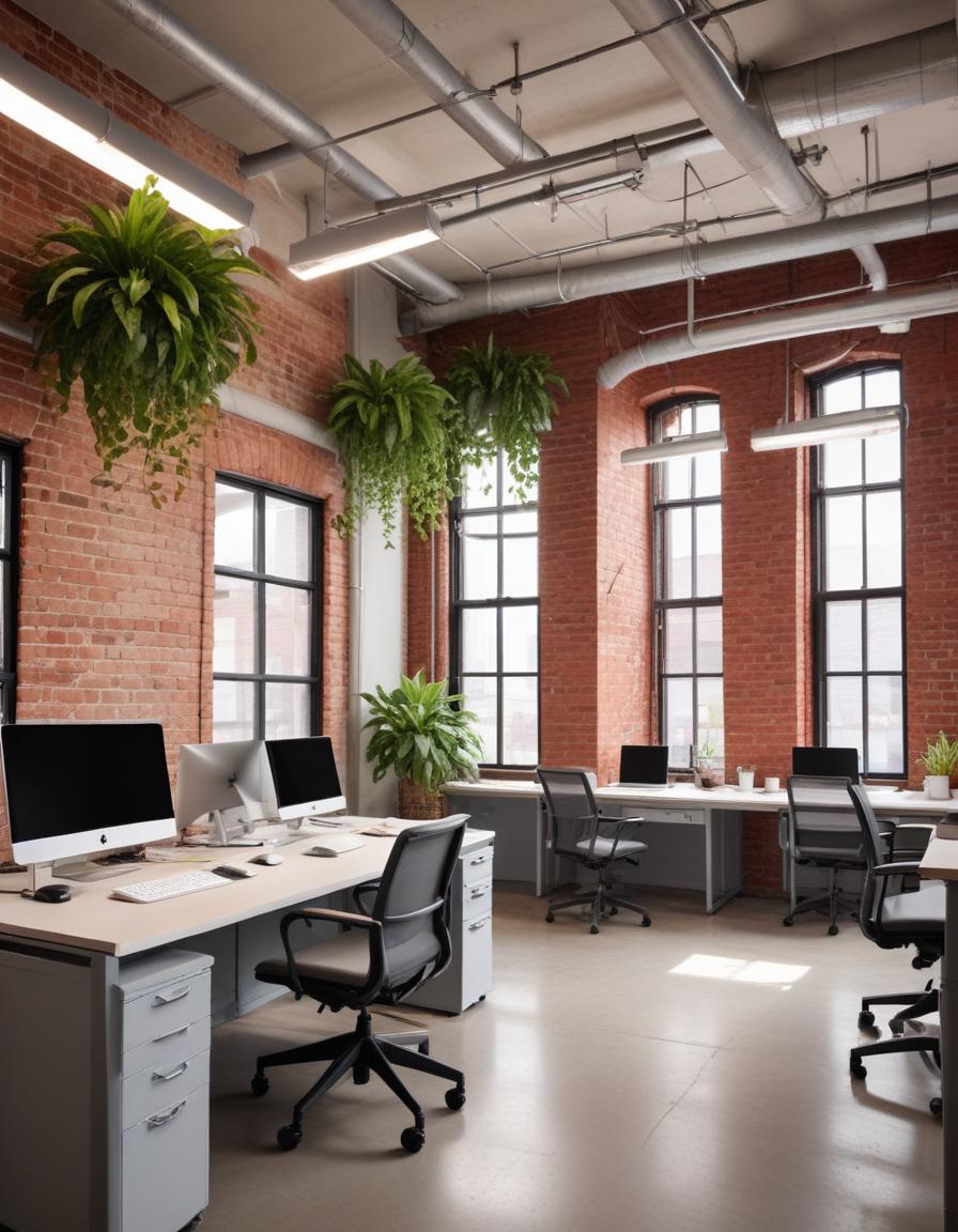 architecture, brick, building, ceiling, chair, design, desk, furniture, interior, light, modern, office, pipe, plant, room, space, wall, window, work, workspace