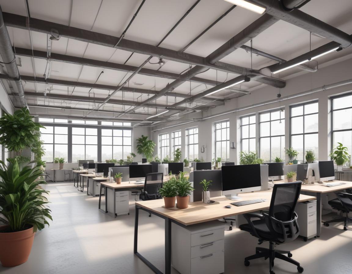 A modern office with large windows and a bright, open layout