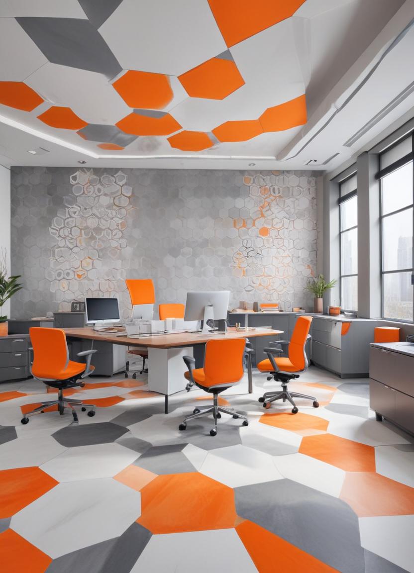Modern office with orange and gray geometric decor
