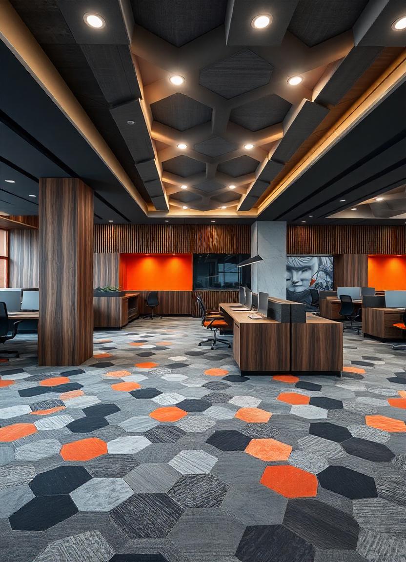 A spacious, modern office with a geometric patterned floor. The floor is a mixture of grey and orange hexagonal tiles.