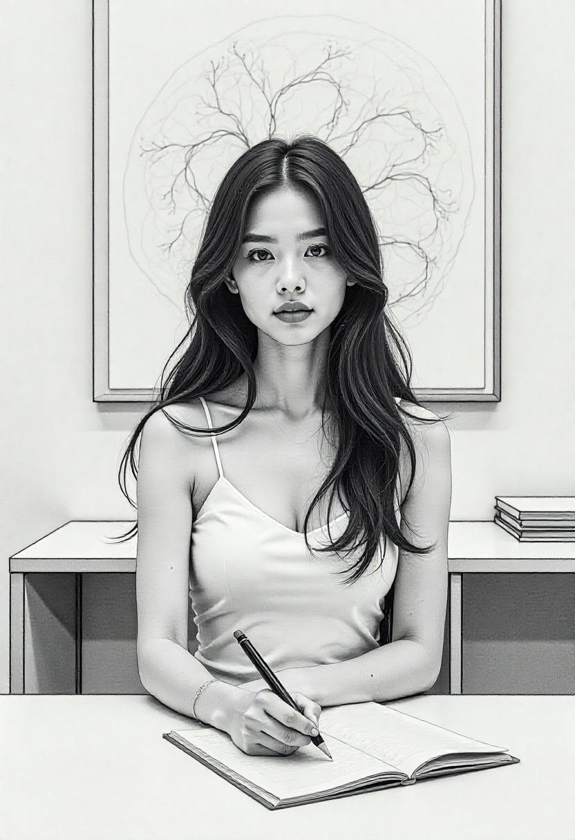 books, dark, desk, female, framed, gray, hair, hand, long, notebook, pen, pencil, right, shelf, sitting, tank, top, white, woman, writing
