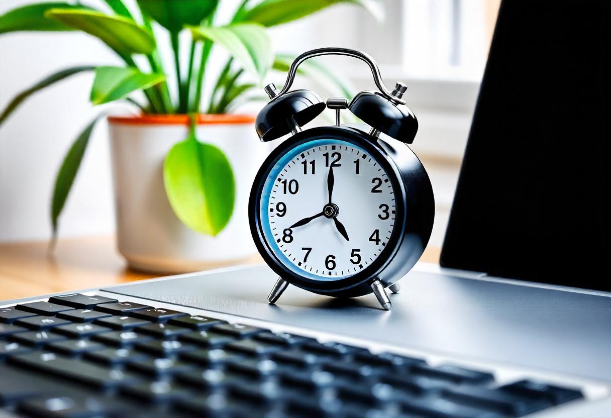 afternoon, alarm clock, analog, black clock, business, clock, deadline, desk, digital, keyboard, laptop, morning, office, productivity, reminder, schedule, technology, time, time management, work
