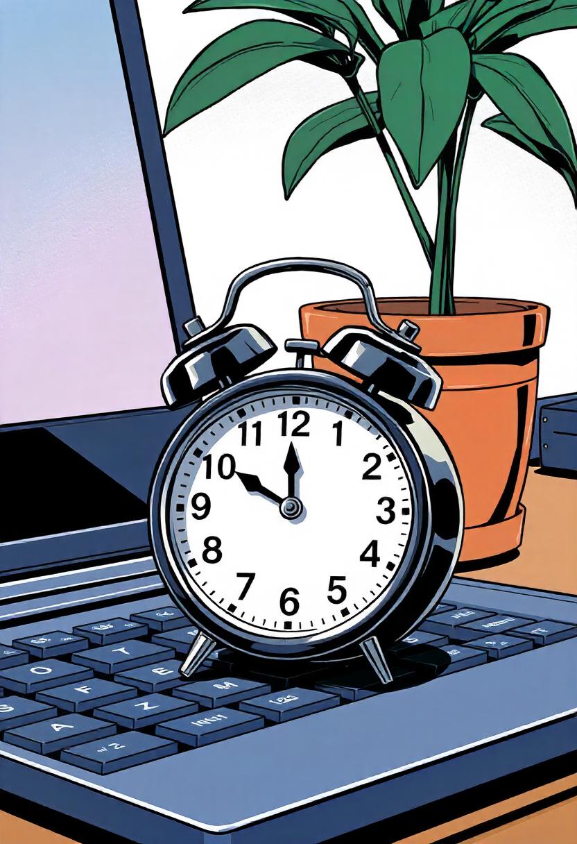 00. A potted plant is in the background.: alarm clock, laptop, keyboard, plant, potted plant, time, 10
