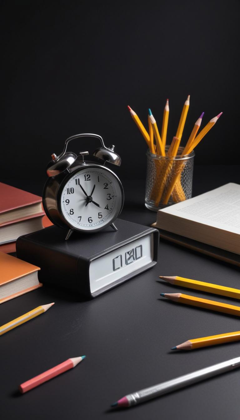 alarm clock, black, book, books, clock, desk, education, glass, learning, office, pencils, school, stationary, study, supplies, table, time, vase, writing, yellow