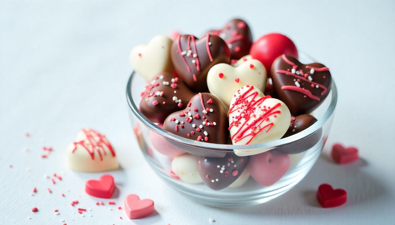 A glass bowl filled with heart-shaped chocolates, some are white with red drizzles, some are dark chocolate with red sprinkles, and some are pink.