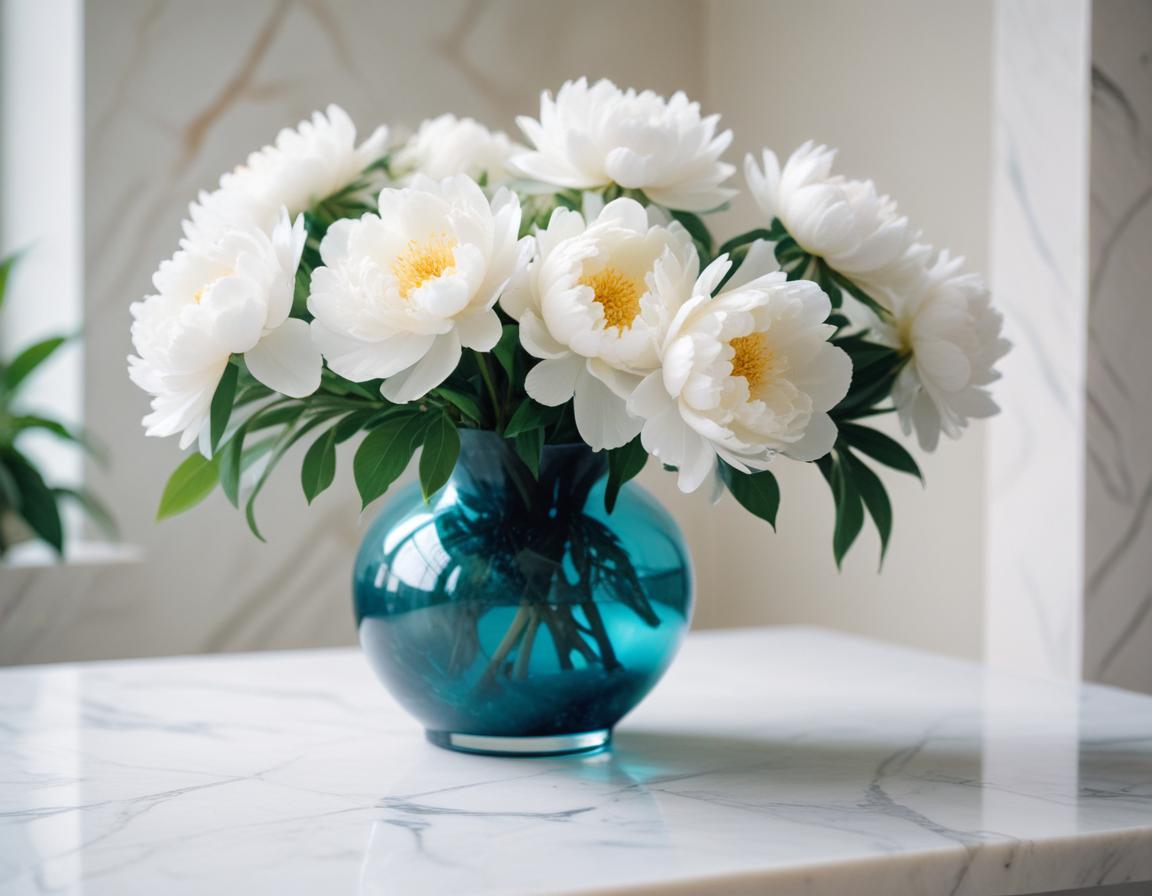 White peonies in a teal vase on a marble table
