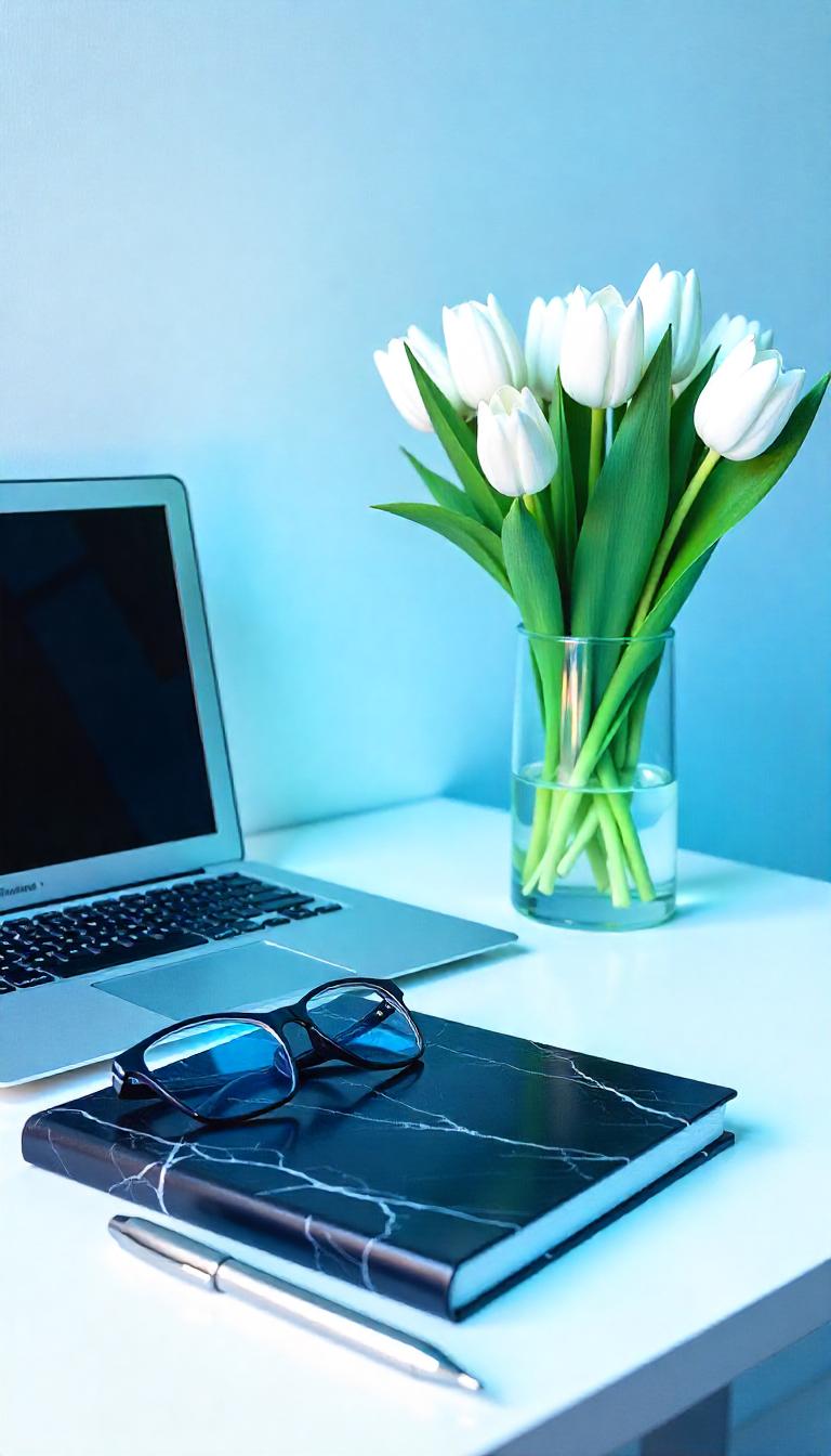 black, desk, flower, glasses, home, laptop, marble, notebook, office, pen, reading, silver, study, technology, tulips, vase, white, work, workspace, writing