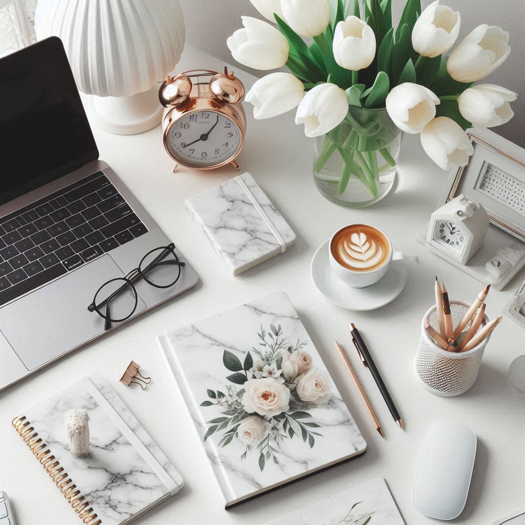 A white desk with a laptop, a cup of coffee, a vase of white flowers, and a few notebooks.