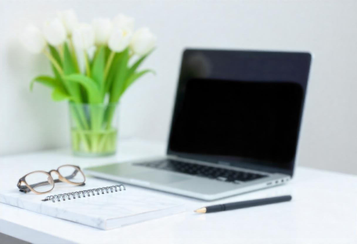 A white desk with a laptop, a spiral notebook, a pair of glasses, and a pen. A vase of white tulips is in the background.
