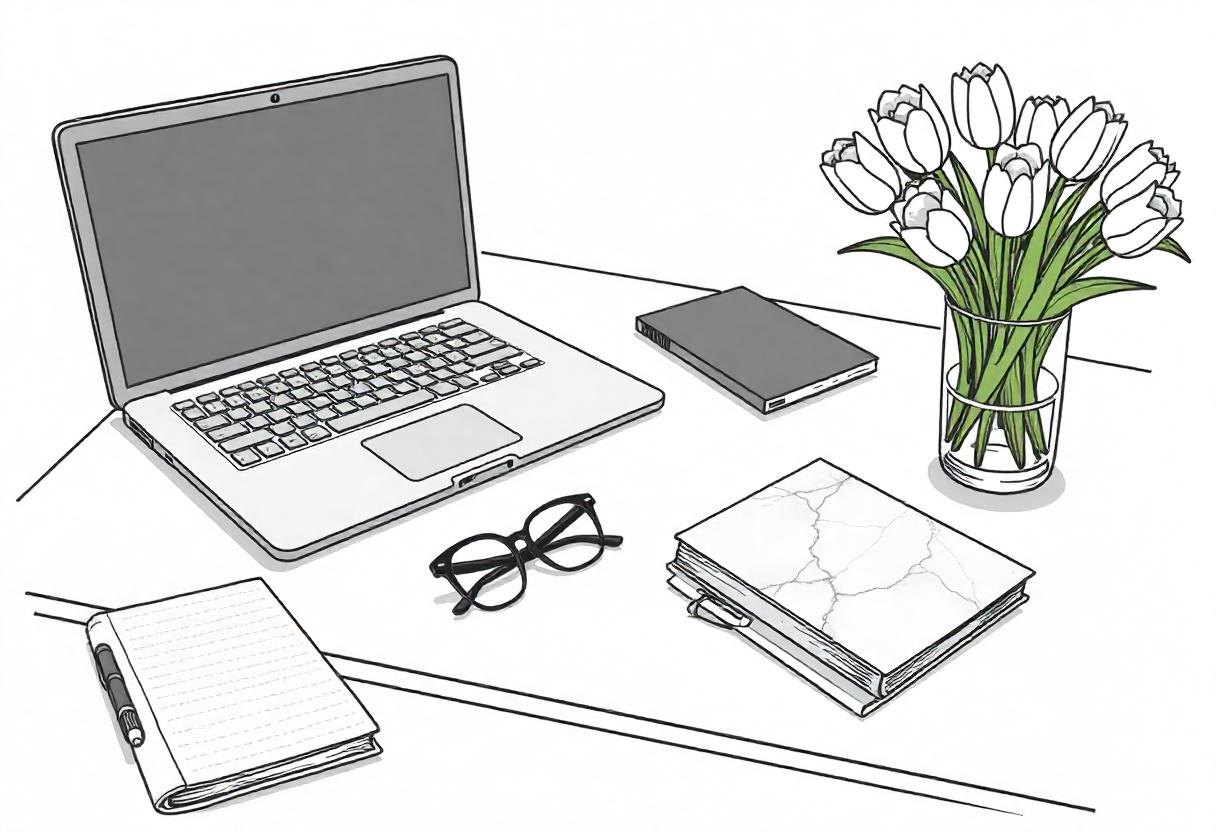 aesthetic, book, bouquet, desk, drawing, flowers, glasses, illustration, laptop, minimalist, notebook, office, organization, pen, productivity, study, vase, white, work, workspace