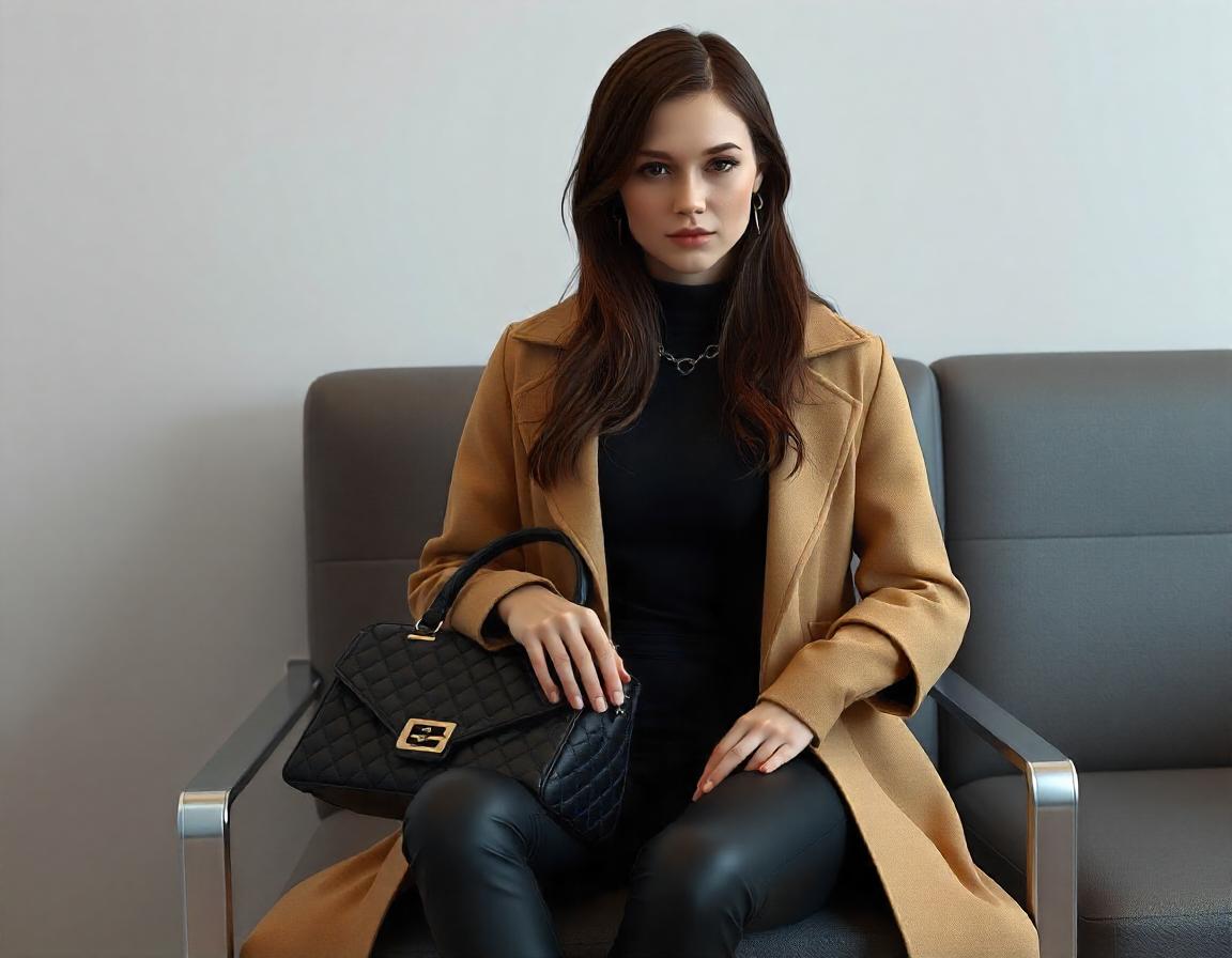 A woman in a brown coat and black pants sits on a grey couch with her legs crossed. She has long brown hair and is holding a black purse.