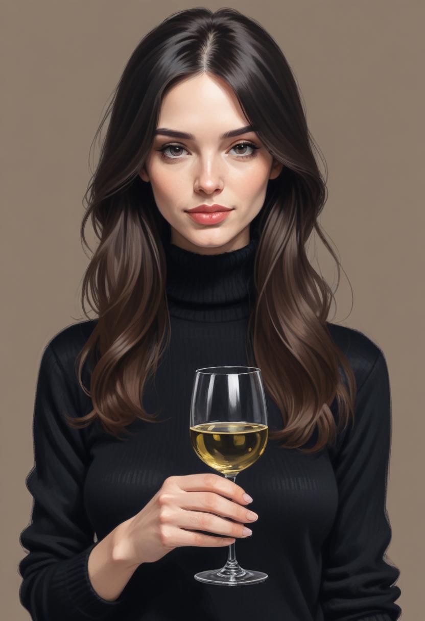 art, black, dark hair, digital art, drink, fashion, female, glass, hand, holding, illustration, long hair, model, portrait, style, sweater, turtleneck, white wine, wine, woman