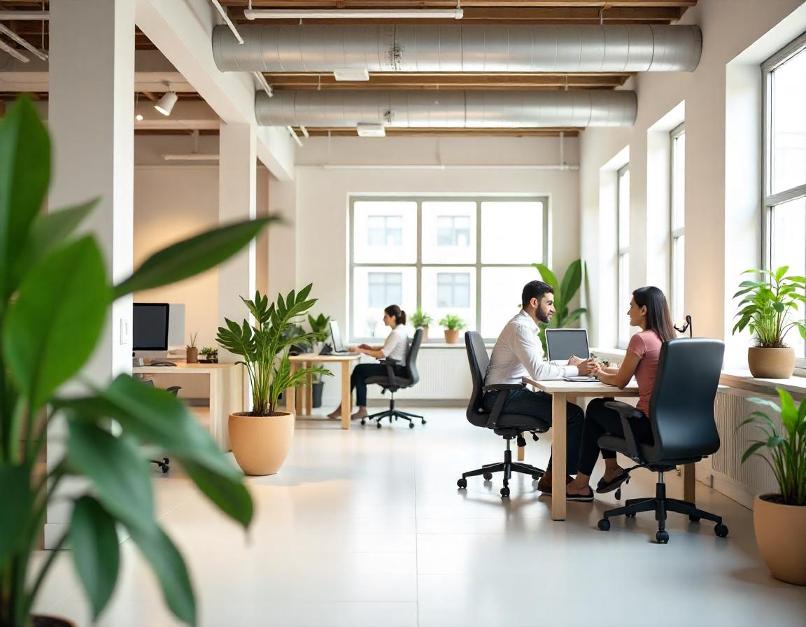 Two people are sitting at a table in a modern office space with windows and plants.