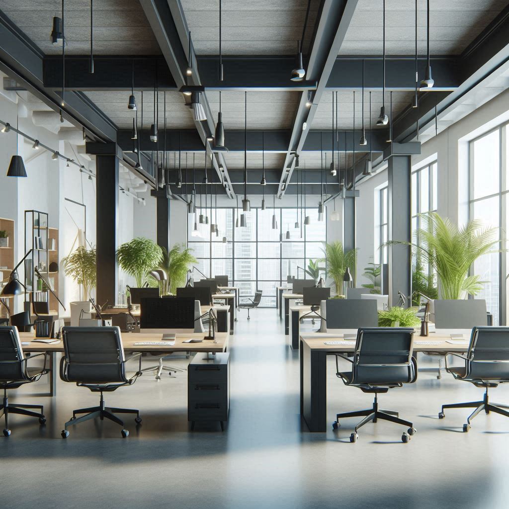 A modern office space with open floor plan and natural light