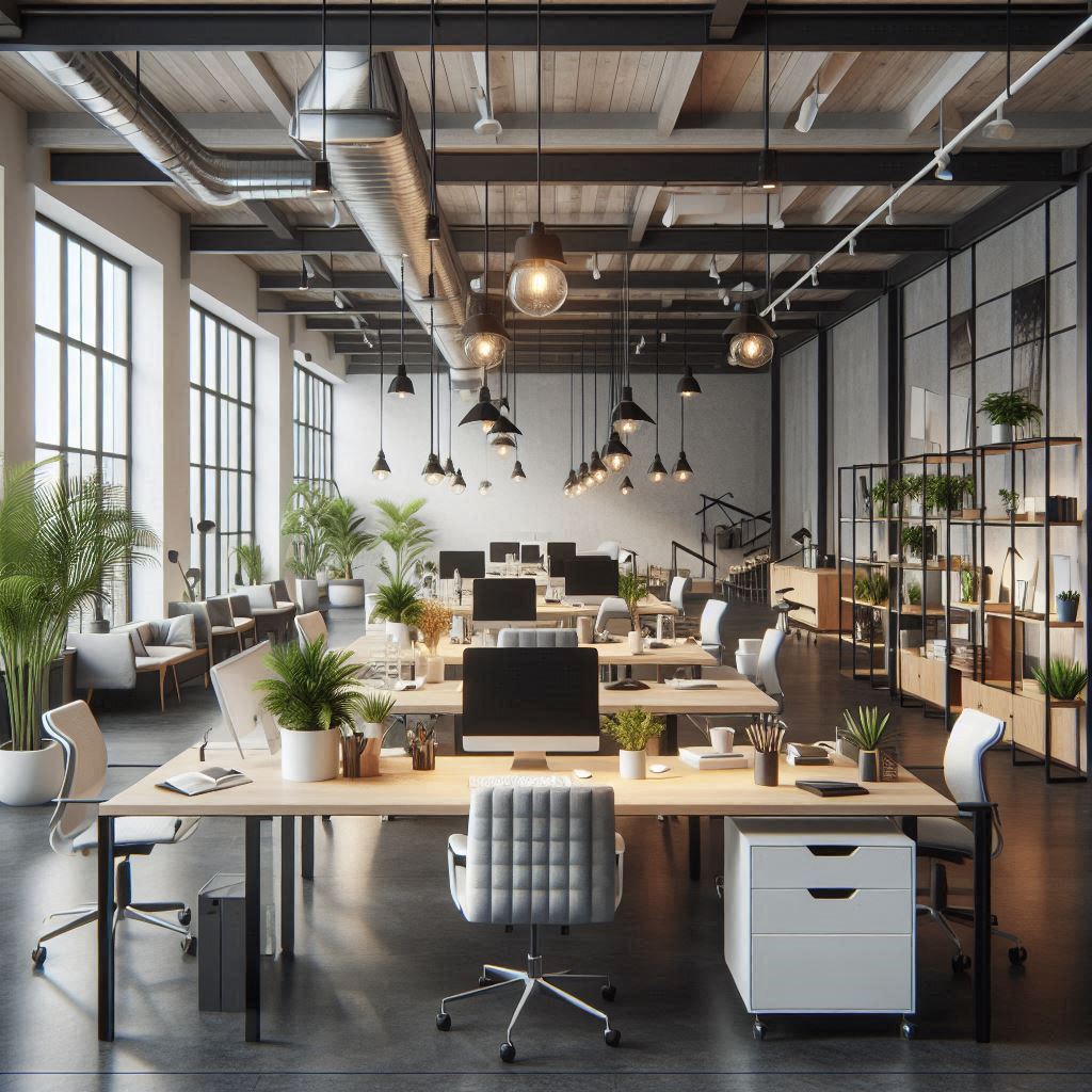 beams, black, cabinet, chairs, design, desk, desks, exposed, furniture, industrial, interior, lighting, modern, office, plants, space, white, windows, wooden, workspace