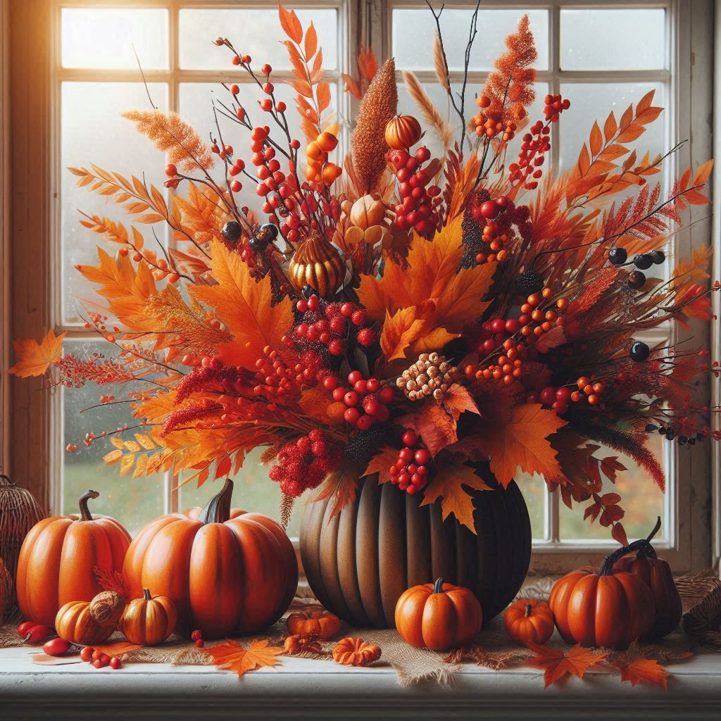 A windowsill decorated with fall foliage and pumpkins. An orange pumpkin vase sits on a burlap runner, with a large pumpkin on either side of it.