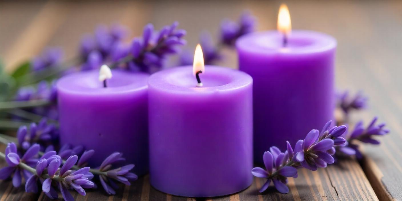 Three purple candles are lit, surrounded by lavender
